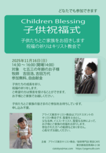 七五三を迎えるお子様とご家族を祝福しお祈りします。ご家族でぜひお越しください。(礼拝はどなたでも参加できます。)